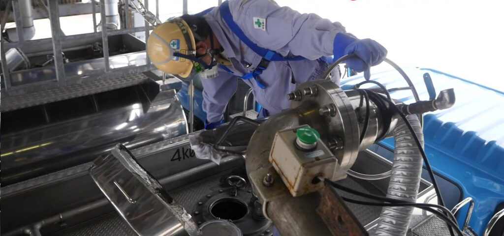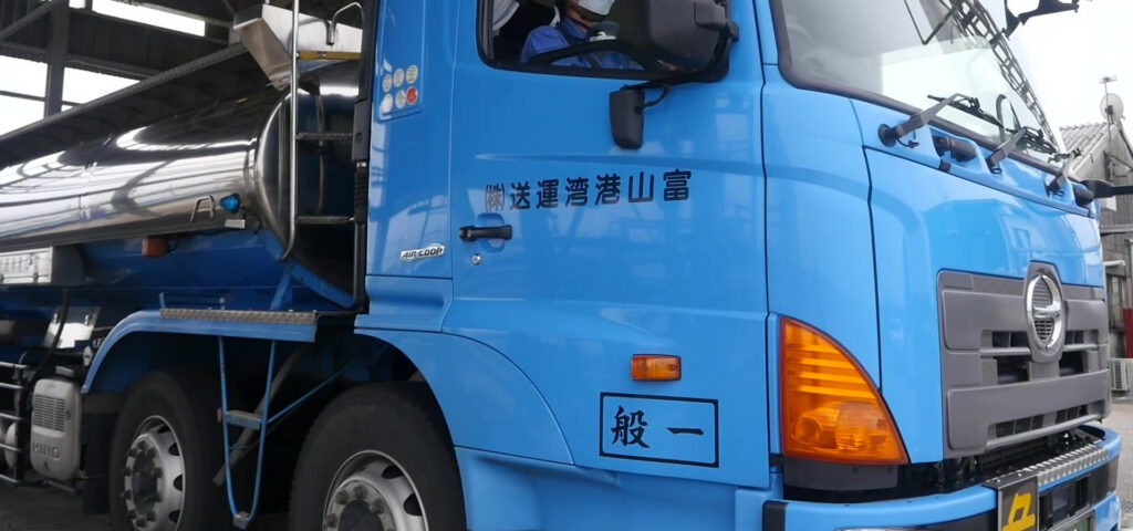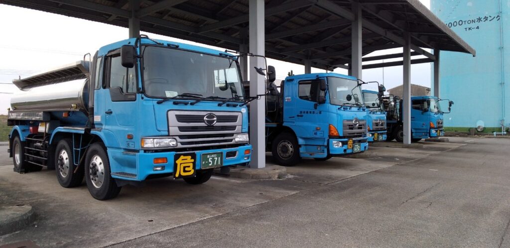 令和2年には、新事務所も建設され、安全かつ効率的な管理のもと、作業が行われています。作業内容としては、専用タンカーによって海上輸送された製品を安全・確実に陸揚げ、タンク貯蔵のうえ、専用タンクローリーで輸送します。